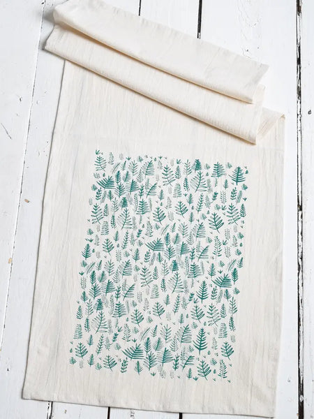 One large organic cotton flour sack tea towel (29" X 30"), screen printed with our original Ferns design. These are hand printed by us in small batches using environmentally friendly water-based ink.