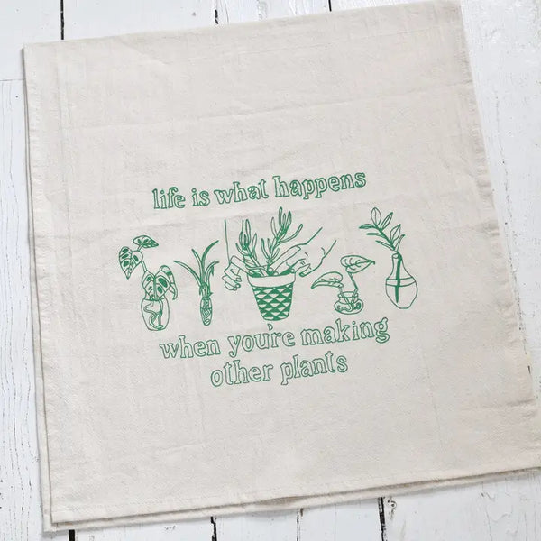 One large organic cotton flour sack tea towel (29" X 30"), screen printed with our original Plants design. These are hand printed by us in small batches using environmentally friendly water-based ink.